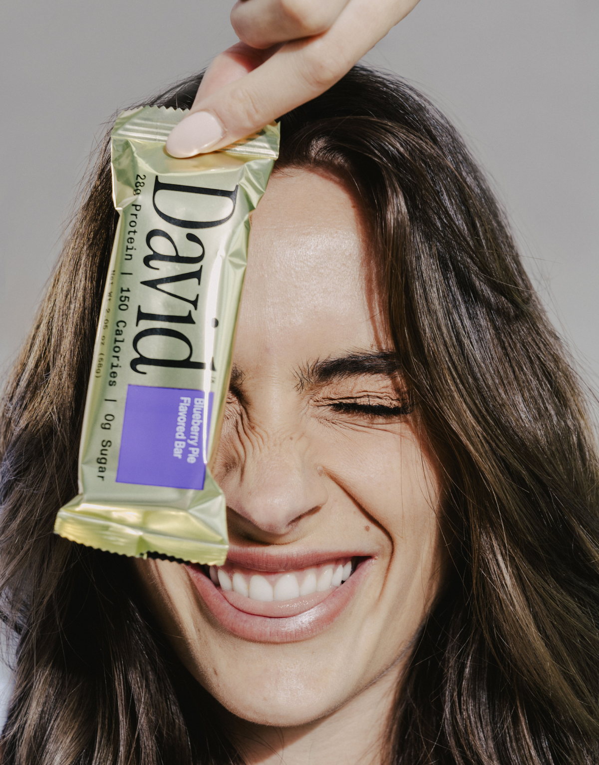 woman holding David protein bar on her back woman holding David protein bar on her back