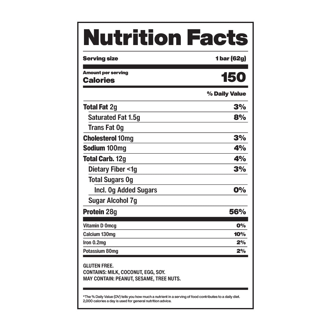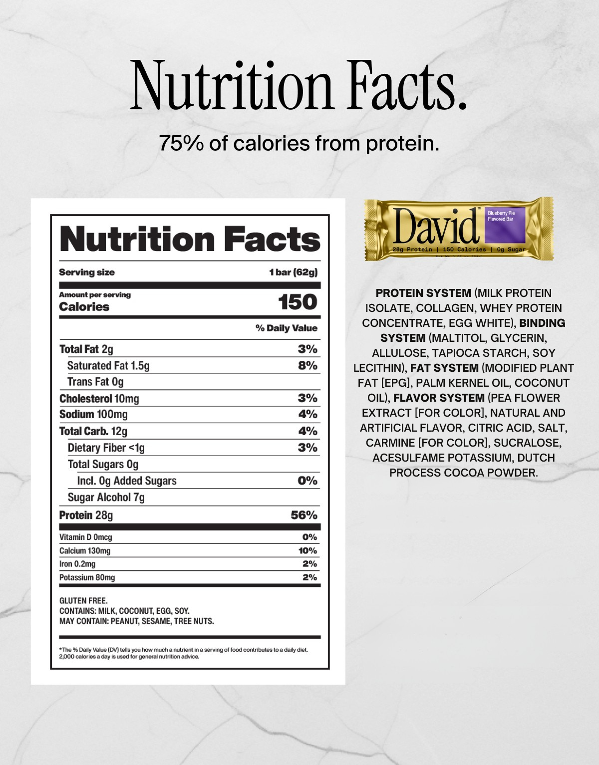 David has 28g of protein and only 150 calories. This is 75% CFP (CFP = Calories from Protein / Total Calories). The most protein-dense bar in existence. A diversity of protein sources comes together for a perfect 1.0 protein digestibility-corrected amino acid score (PDCAAS), meaning this protein is the best amino acid profile for both muscle building and optimal bodily functioning (including skin, hair, and nail health).