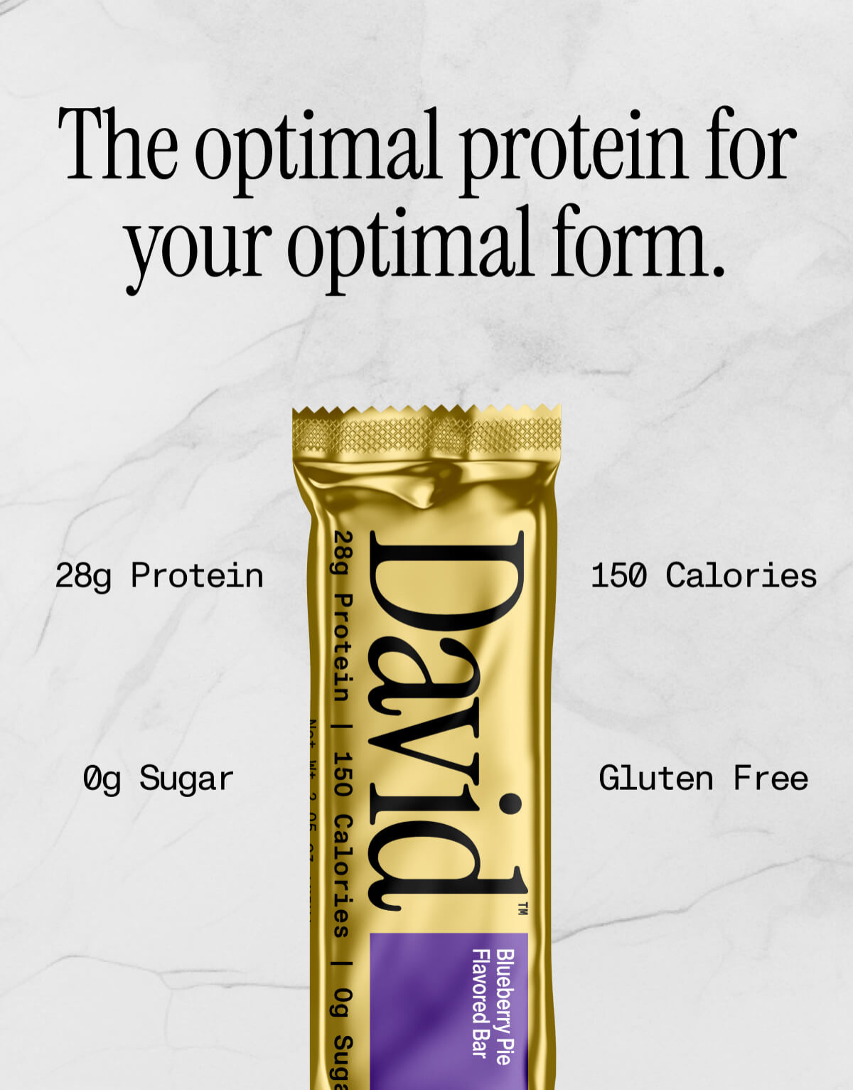 David has 28g of protein and only 150 calories. This is 75% CFP (CFP = Calories from Protein / Total Calories). The most protein-dense bar in existence. A diversity of protein sources comes together for a perfect 1.0 protein digestibility-corrected amino acid score (PDCAAS), meaning this protein is the best amino acid profile for both muscle building and optimal bodily functioning (including skin, hair, and nail health).