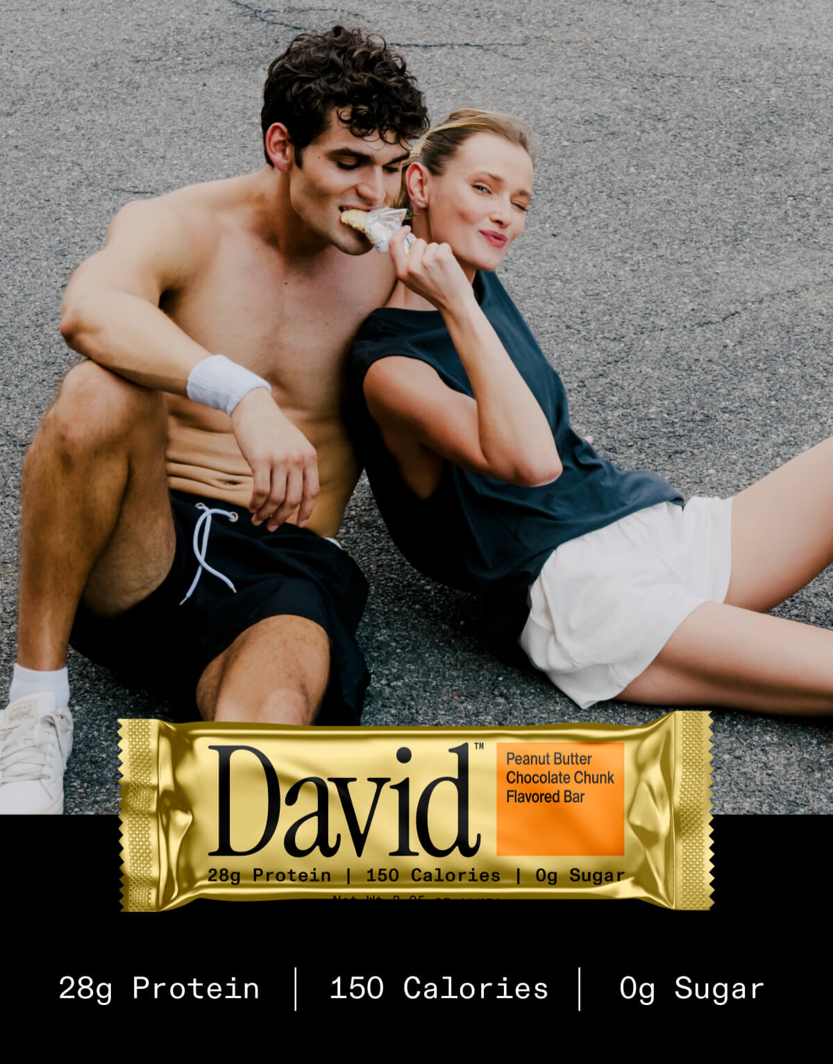 David has 28g of protein and only 150 calories. This is 75% CFP (CFP = Calories from Protein / Total Calories). The most protein-dense bar in existence. A diversity of protein sources comes together for a perfect 1.0 protein digestibility-corrected amino acid score (PDCAAS), meaning this protein is the best amino acid profile for both muscle building and optimal bodily functioning (including skin, hair, and nail health).