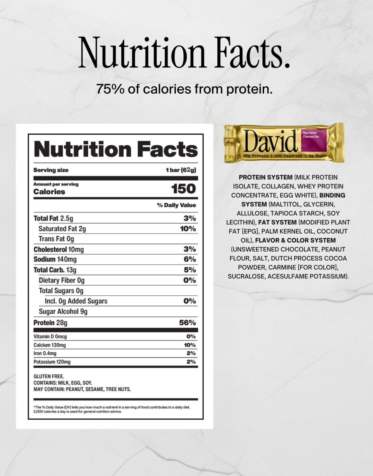 David has 28g of protein and only 150 calories. This is 75% CFP (CFP = Calories from Protein / Total Calories). The most protein-dense bar in existence. A diversity of protein sources comes together for a perfect 1.0 protein digestibility-corrected amino acid score (PDCAAS), meaning this protein is the best amino acid profile for both muscle building and optimal bodily functioning (including skin, hair, and nail health).