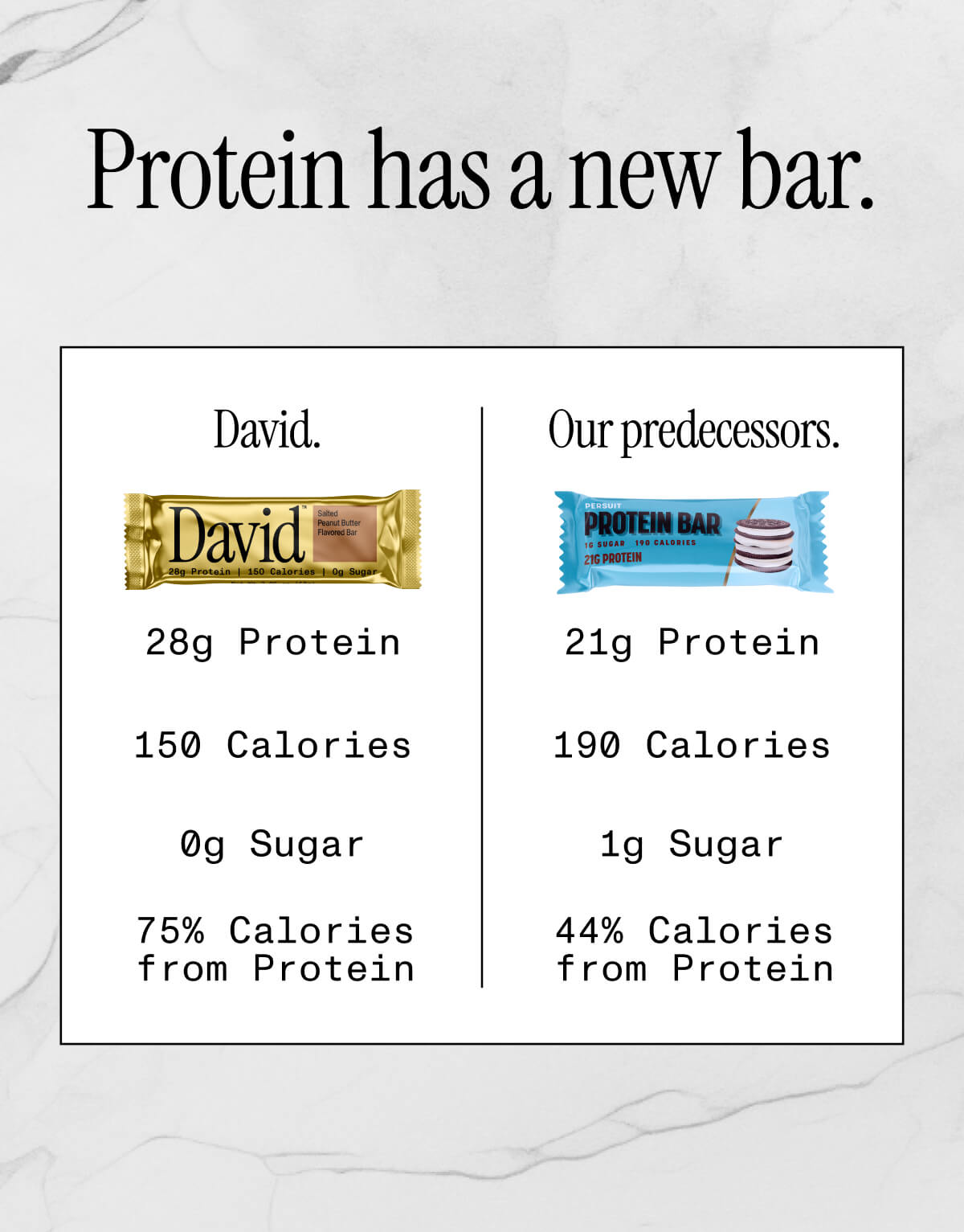 David has 28g of protein and only 150 calories. This is 75% CFP (CFP = Calories from Protein / Total Calories). The most protein-dense bar in existence. A diversity of protein sources comes together for a perfect 1.0 protein digestibility-corrected amino acid score (PDCAAS), meaning this protein is the best amino acid profile for both muscle building and optimal bodily functioning (including skin, hair, and nail health).